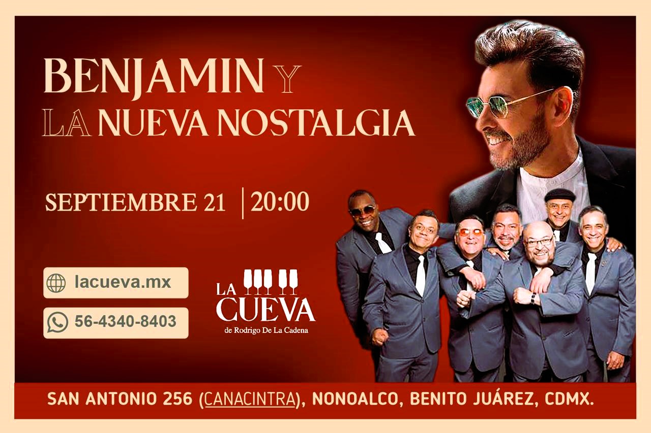 Este sábado 21 de septiembre a las 8:00 p.m., La Cueva de Rodrigo de la Cadena será el escenario de una noche memorable con la presentación de Benjamín y La Nueva Nostalgia. Este evento es muy esperado por los amantes de la música romántica y el bolero, quienes disfrutarán de una velada cargada de emotividad, con grandes éxitos que han marcado varias generaciones. Boletos a la venta en lacueva.mx