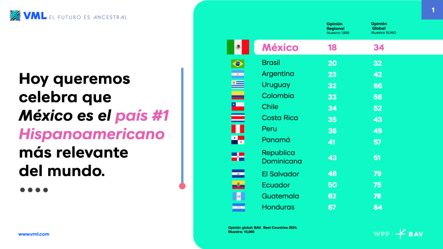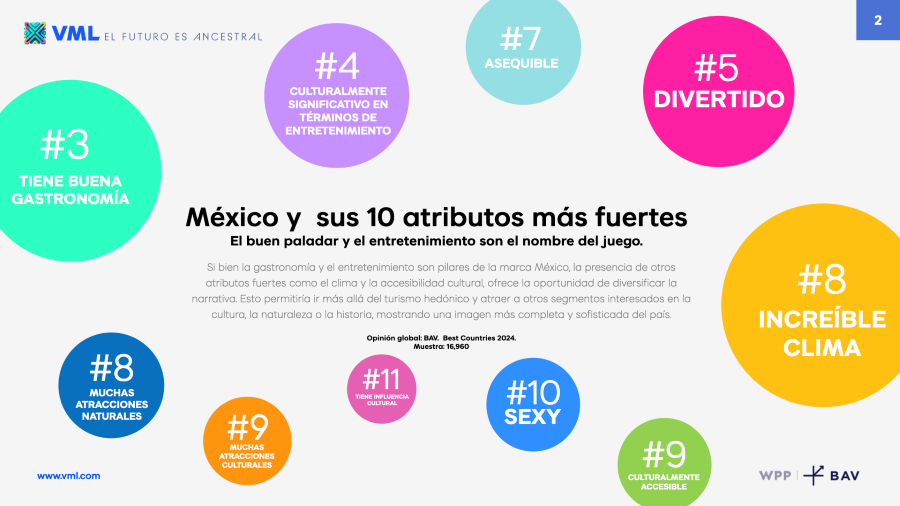 El estudio, realizado en colaboración con BAV Group, recolectó datos de 16,960 personas en 89 mercados. A través de 73 atributos, el informe mide factores como calidad de vida, innovación, apertura a los negocios y herencia cultural, proporcionando una radiografía completa de cómo es percibido cada país en aspectos clave. En este caso, “México es visto como un país aventurero, dispuesto a abrirse a nuevos negocios, lo que lo convierte en una tierra fértil para la inversión y el crecimiento económico, características fundamentales para su fortalecer su imagen ante el mundo”, mencionó Mariano Russo, CDO de VML México.