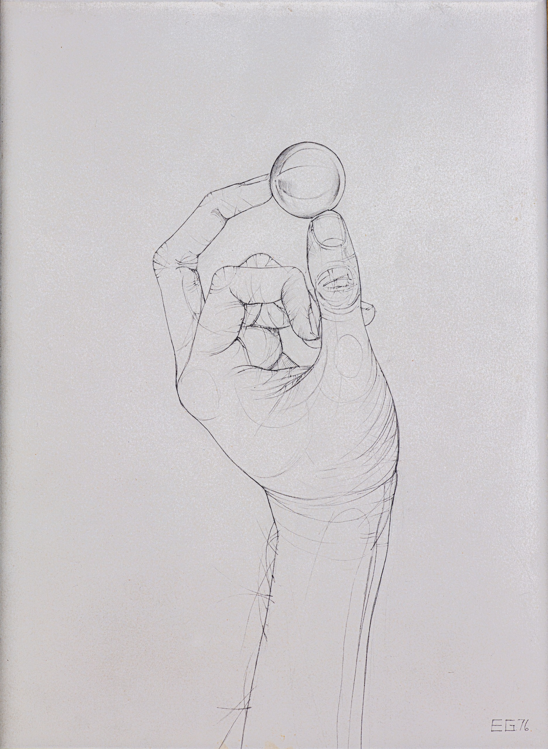 En catorce de estos dibujos aparece su mano izquierda, a veces con los dedos extendidos o flexionados, casi siempre sosteniendo objetos que remiten a un repertorio iconográfico propio: una hoja de papel; un frasco de vidrio sin tapa; una canica; una moneda; una cuchilla de afeitar; un limón partido y una masa biomorfa difícil de identificar.