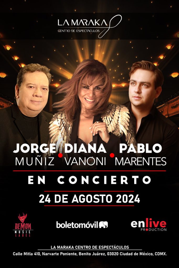 Diana Vanoni llega con sus éxitos junto a Jorge “Coque Muñiz y a Pablo Marentes para proseguir con su gira nacional presentándose este Se presentan el Sábado 24 de Agosto en el Centro de Espectáculos La Maraka. Boletos a la venta en taquillas del inmueble y en el Sistema Boletomovil.