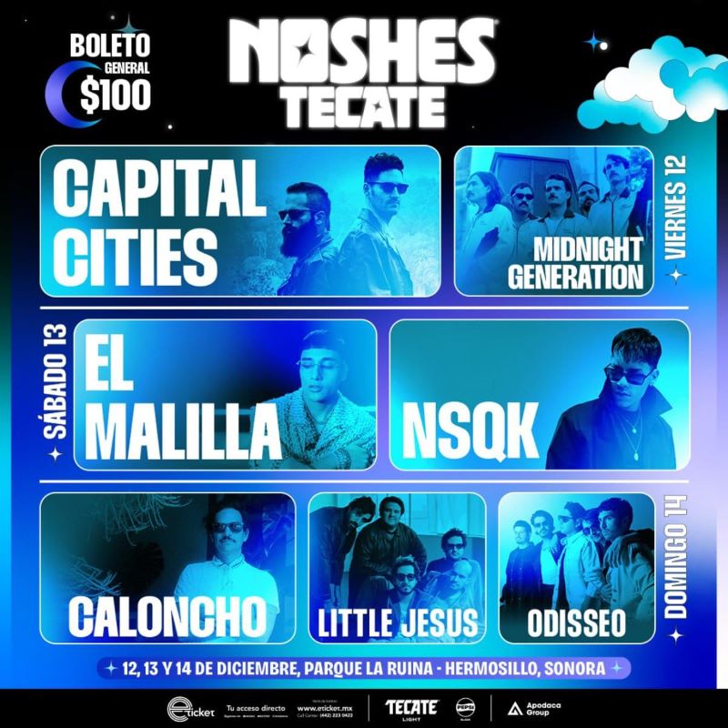 El viernes 12 de diciembre, la fiesta arranca con Capital Cities, una de las agrupaciones más icónicas del indie-pop global, acompañados por el talento sonorense de Midnight Generation. El sábado 13, el escenario recibirá a El Malilla y NSQK, dos nombres clave dentro de la nueva ola del reggaetón mexicano y la música urbana alternativa. Finalmente, el domingo 14, la primera edición de Noshes Tecate cerrará con una combinación imperdible: Caloncho, Little Jesus y Odisseo, referentes del indie nacional que han conquistado festivales y audiencias en todo el país.