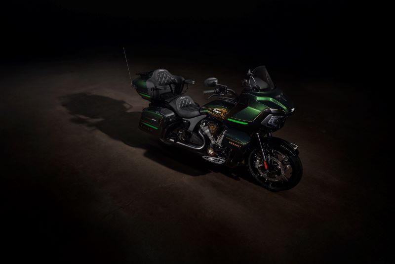 La Indian Pursuit Elite inspira su estilo en la producción de 20,000 motocicletas PowerPlus en 1916 para el Ejército de los Estados Unidos. La motocicleta Touring de edición limitada presenta una pintura tricolor, con acabados Black Candy y Black Forest Candy de primera calidad, realzados con el arte de los detalles Championship Gold pintados a mano. La pintura personalizada se complementa con acabados negros Dark Horse premium, dando a la Indian Pursuit Elite un estilo sofisticado que sobresale. Cada Indian Pursuit Elite cuenta con tapas de motor PowerPlus 112 distintivas e insignias Elite exclusivas por todas partes, incluida una consola central numerada individualmente.