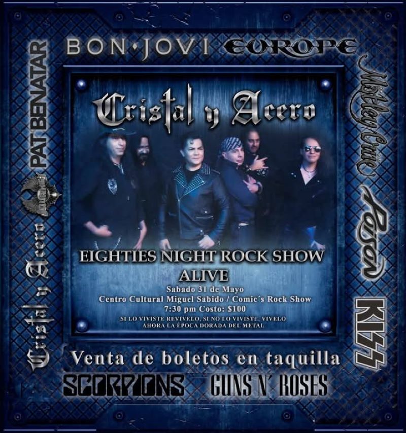 Cristal y Acero hará homenaje a las bandas icónicas de los años ochenta de heavy y hard rock y se presentan en el Centro Cultural Miguel Sabido (Comics Rock Show) este sábado 31 de mayo a las 7:30pm. Venta de boletos en taquilla el día del evento a un costo de $100.00.