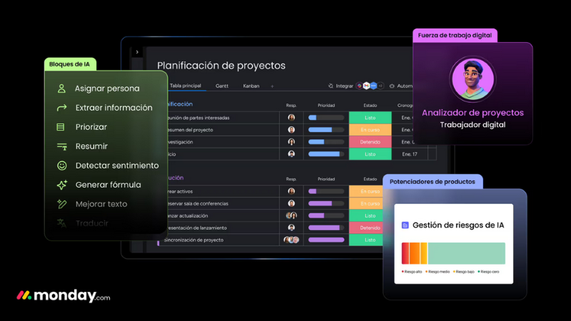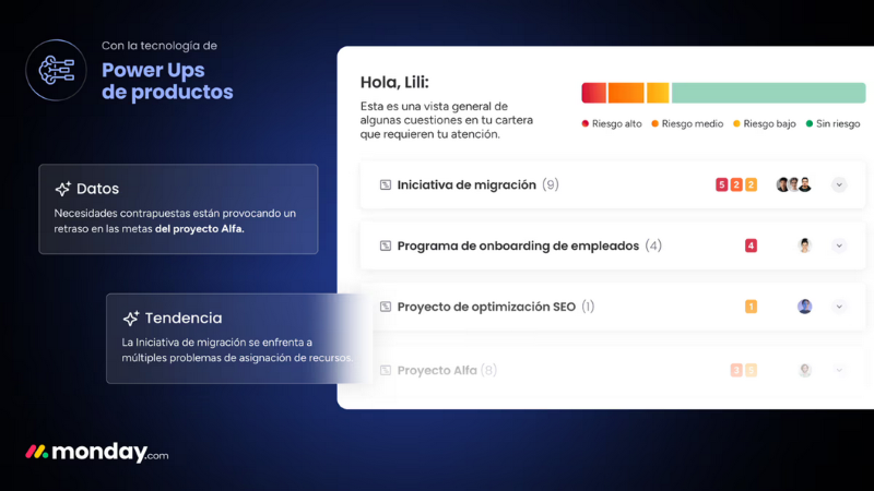 Potenciadores de los productos: Las capacidades de IA se integrarán a la perfección en todo el conjunto de productos de monday.com para ayudar a los clientes a afrontar los retos más críticos. Desde la gestión de recursos y la gestión predictiva de riesgos hasta la automatización de datos de CRM y la resolución de tickets de servicio en tiempo real, estas capacidades permiten a los equipos tomar decisiones más rápidas y agilizar los procesos.