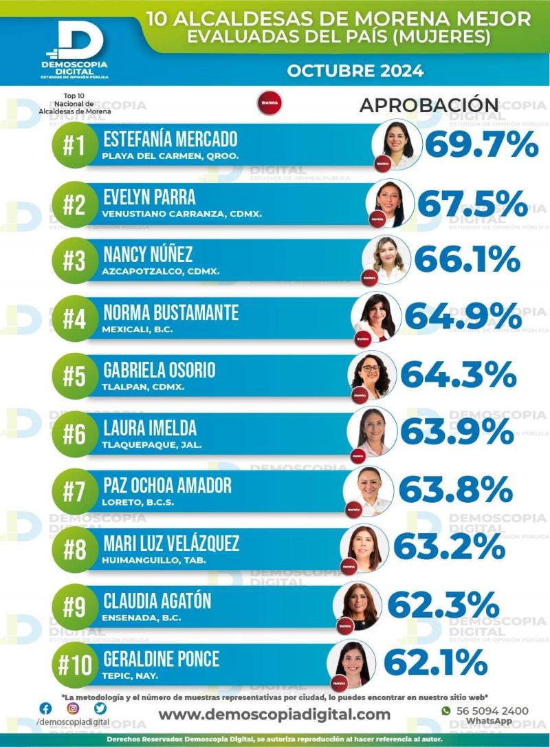 De acuerdo con el estudio de opinión pública realizado por Demoscopía Digital, Nancy Núñez se encuentra en el tercer lugar de las alcaldesas de Morena mejor evaluadas del país, con 66.1% de aprobación.