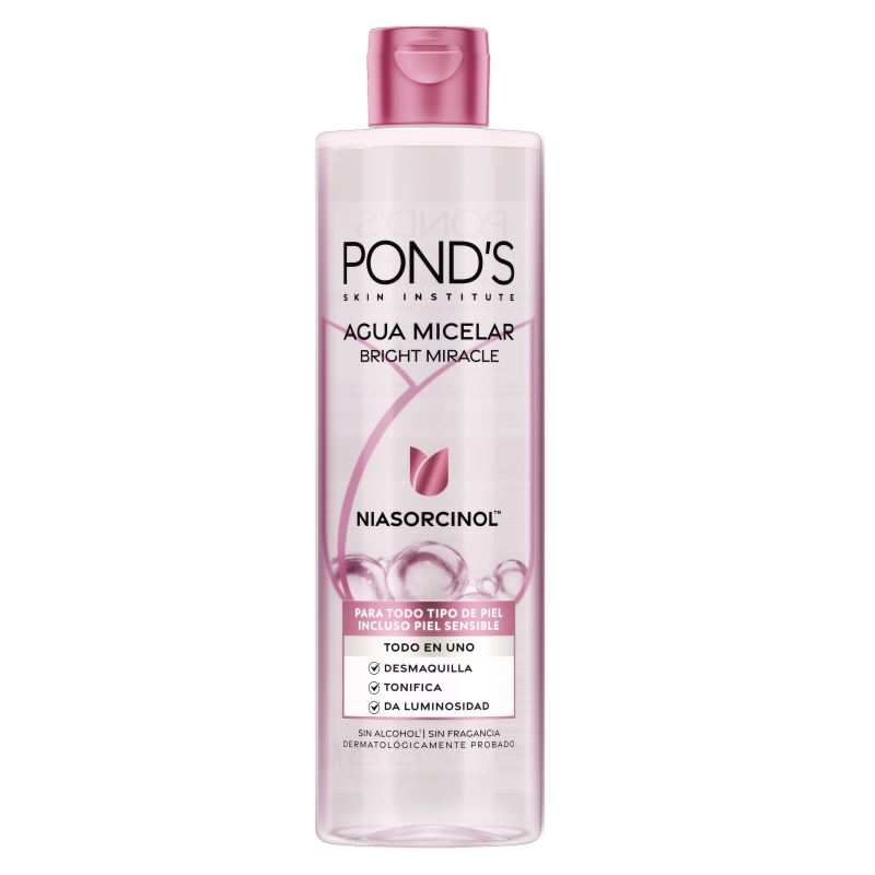 - Agua Micelar Bright Miracle: todo en uno, desmaquilla, tonifica y da luminosidad, removiendo hasta el 99% del maquillaje en una sola pasada. Ideal incluso para piel sensible, sin alcohol* ni fragancia. Además, ayuda a minimizar la apariencia e los poros.