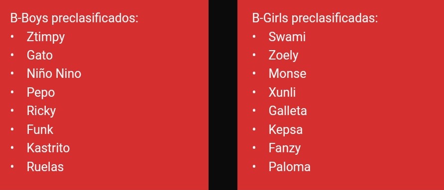 La final nacional de Red Bull BC One Cypher México se llevará a cabo el 23 de noviembre en la explanada de Gran Terraza Coapa y será un evento abierto al público. Los primeros 8 b-boys y 8 b-girls clasificados se determinaron de acuerdo a los finalistas del año pasado, mientras que los restantes se definirán en la clasificatoria del 22 de noviembre.