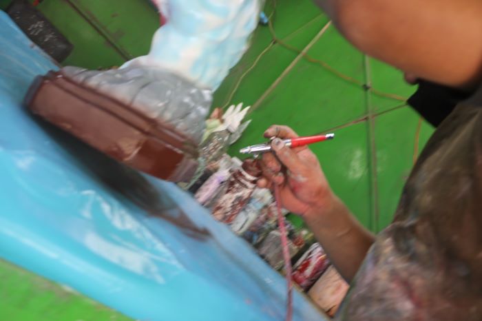 El taller, un espacio modesto donde conviven frascos de pigmentos con estampitas y veladoras, es hoy un negocio familiar. César no solo heredó el oficio de su padre: se lo está transmitiendo a su hijo y a su esposa, quienes lo ayudan en las temporadas altas.