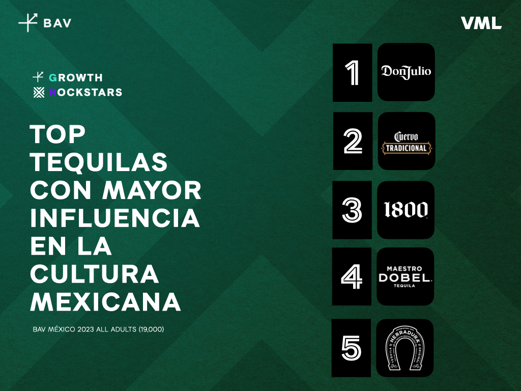 En este contexto, VML México da a conocer el Top 5 de las marcas tequileras con mayor influencia en la cultura mexicana, a través del Growth Rockstars, un análisis basado en el modelo BAV, la herramienta de construcción de marcas más grande y completa a nivel mundial. Este modelo ha medido más de 1,500 marcas, entrevistado a 19,000 personas y analizado 75 métricas en 126 categorías, con más de 15 años de datos históricos.