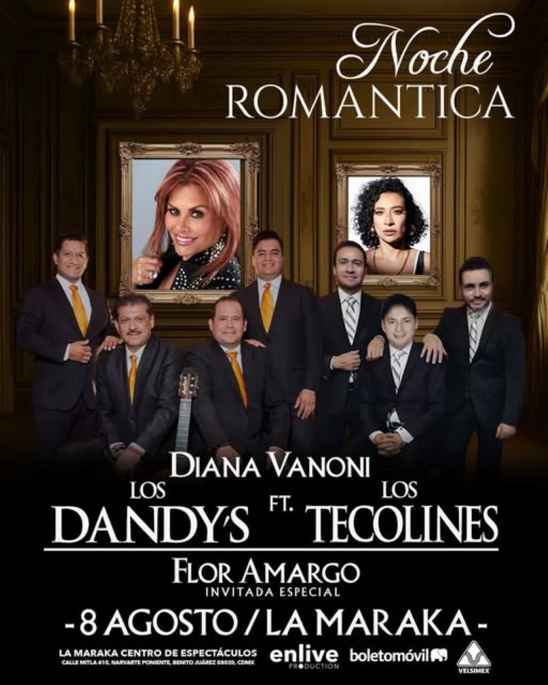 La Ciudad de México se prepara para recibir un hechizo de emociones, nostalgia y belleza melódica el próximo viernes 8 de agosto, cuando el legendario escenario del Centro de Espectáculos La Maraka abra sus puertas a “Una Noche Romántica”, un concierto único que promete avivar los corazones con la voz de Diana Vanoni, una de las intérpretes más emotivas y elegantes de la escena musical contemporánea. Acompañada por la fuerza creativa de Flor Amargo y el legado inmortal de Los Dandys y Los Tecolines, esta gala no será un simple concierto, sino un encuentro entre generaciones y sensibilidades, un homenaje al amor hecho canción, bajo la producción impecable de EnLive Production, promotora que ha revolucionado la manera de vivir el espectáculo en México. Los boletos están a la venta en el Sistema Boletomovil y en taquillas del inmueble.